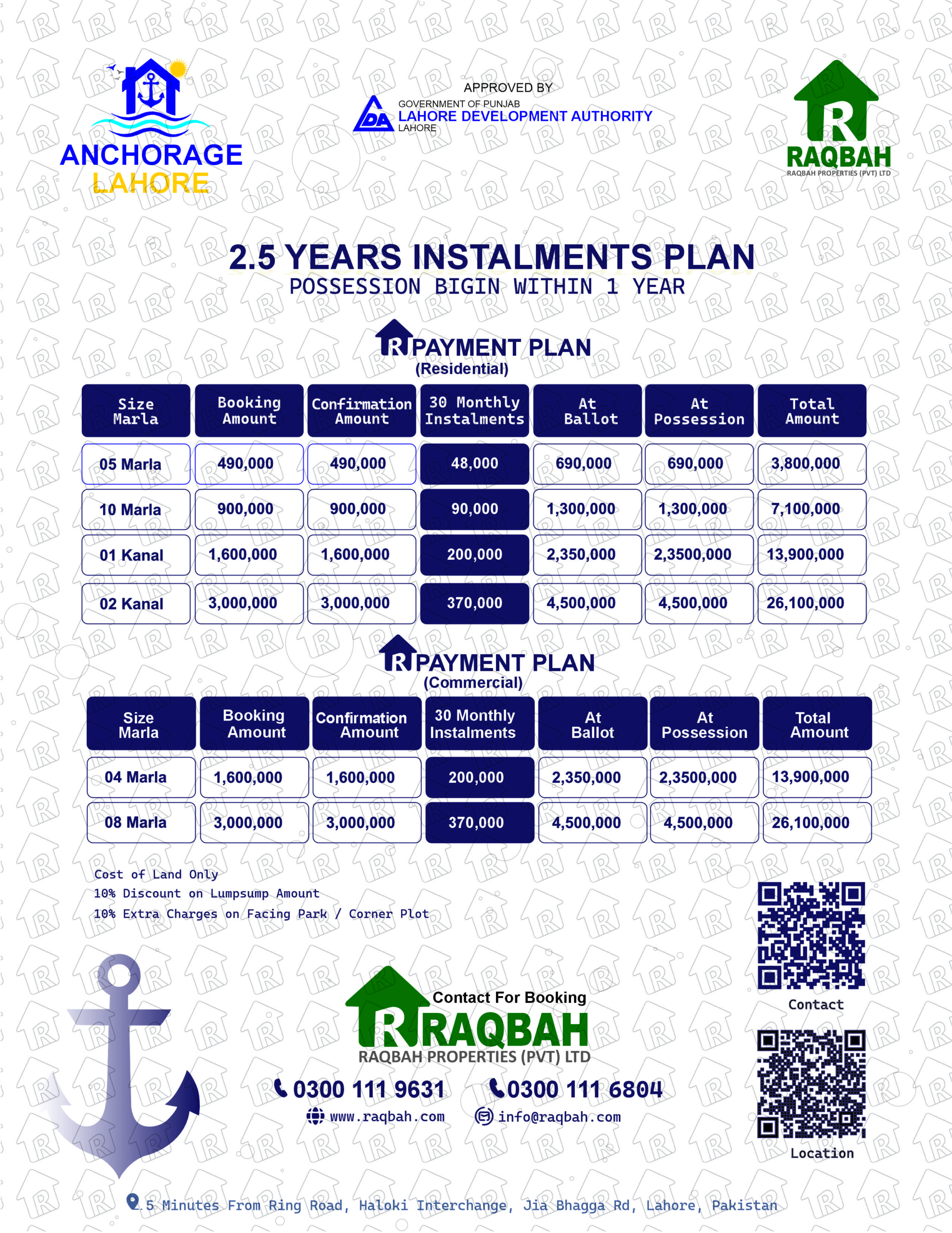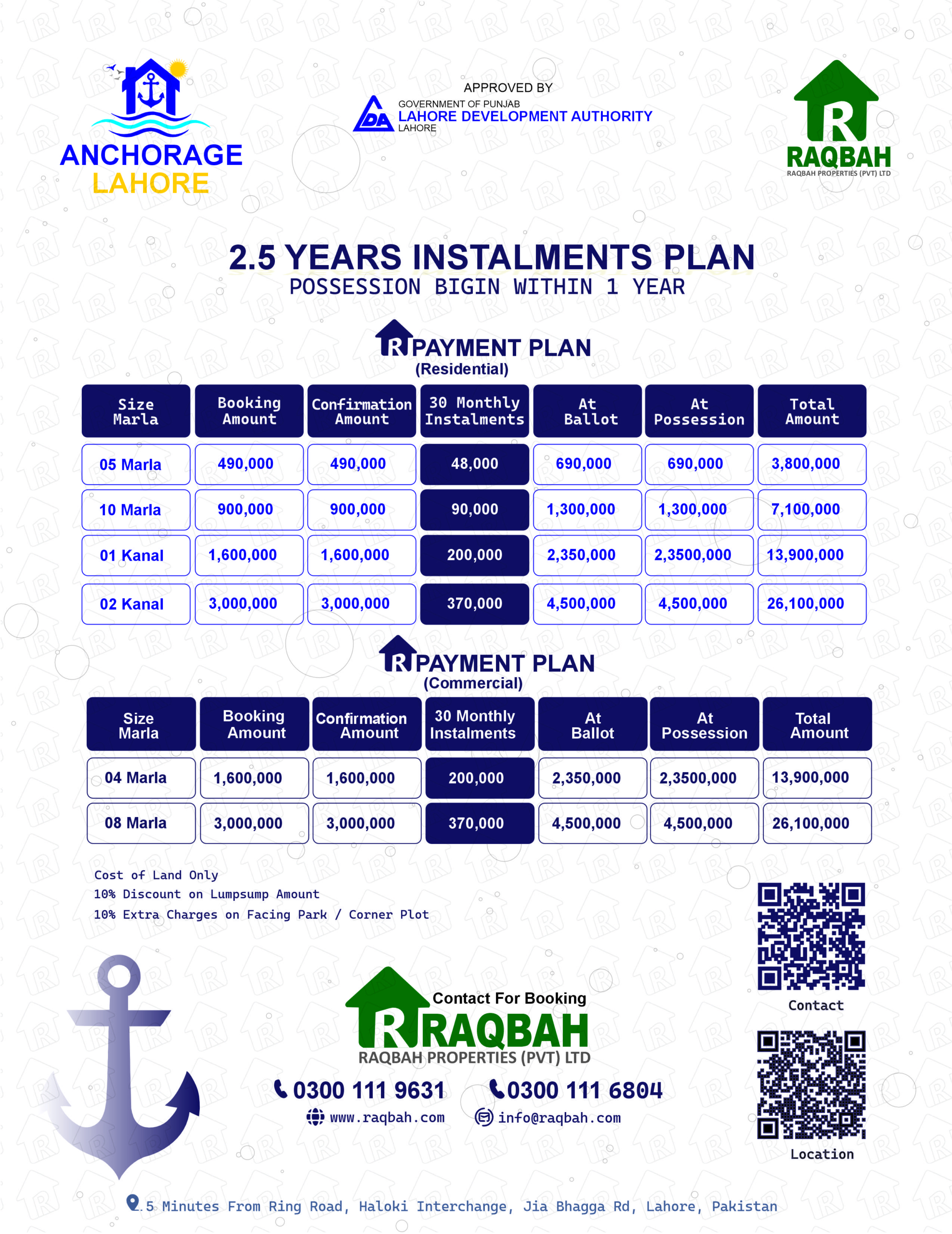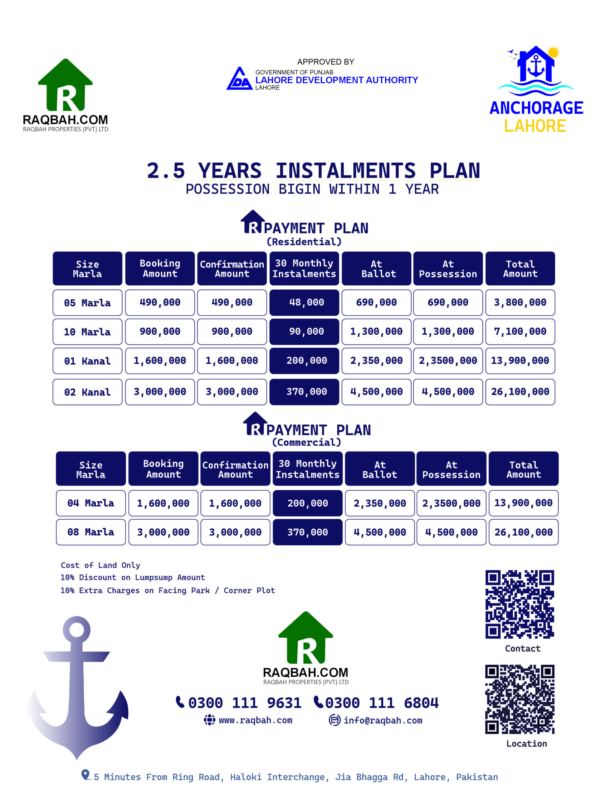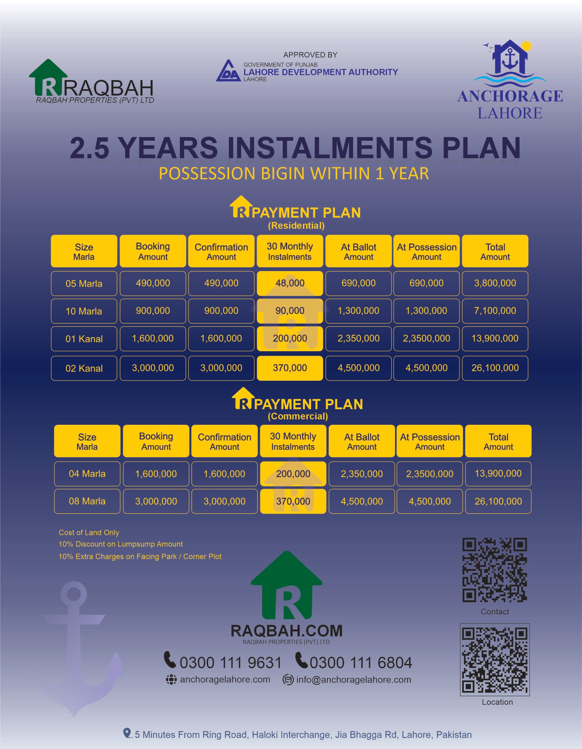 Flexible residential payment plan with easy installments for 5 Marla, 10 Marla, 1 Kanal and 2 Kanal residential plots in Naval Anchorage Lahore.